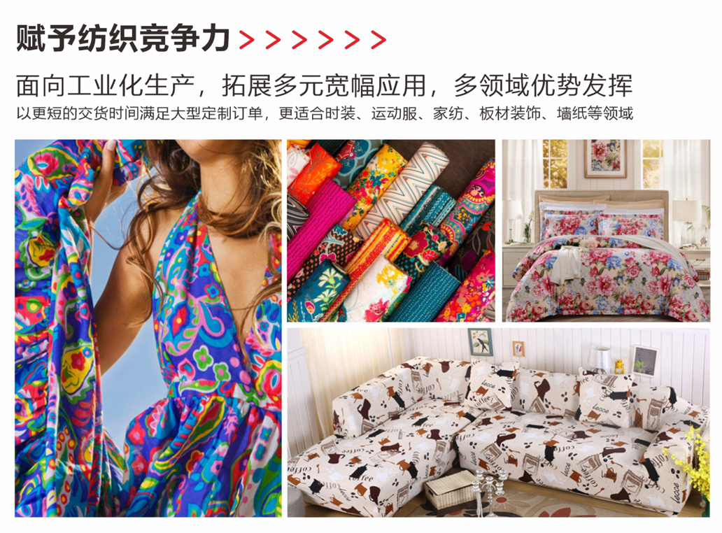 翔彩纺织印花工厂针对不同的行业定制开发了多款机型,现在已经有1.8-3.2米多种不同宽幅印花机,打纸机和直喷印花设备均可定制,可满足多行业多样化的纺织印花需求。
