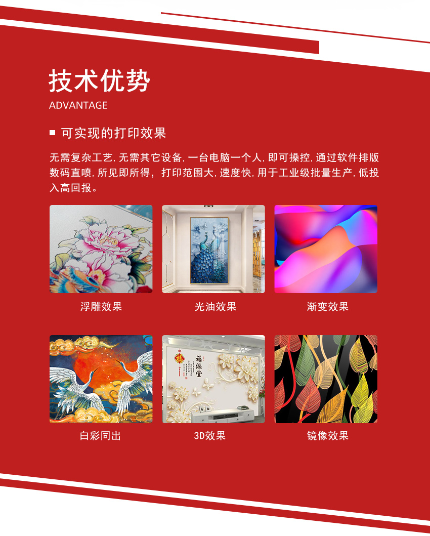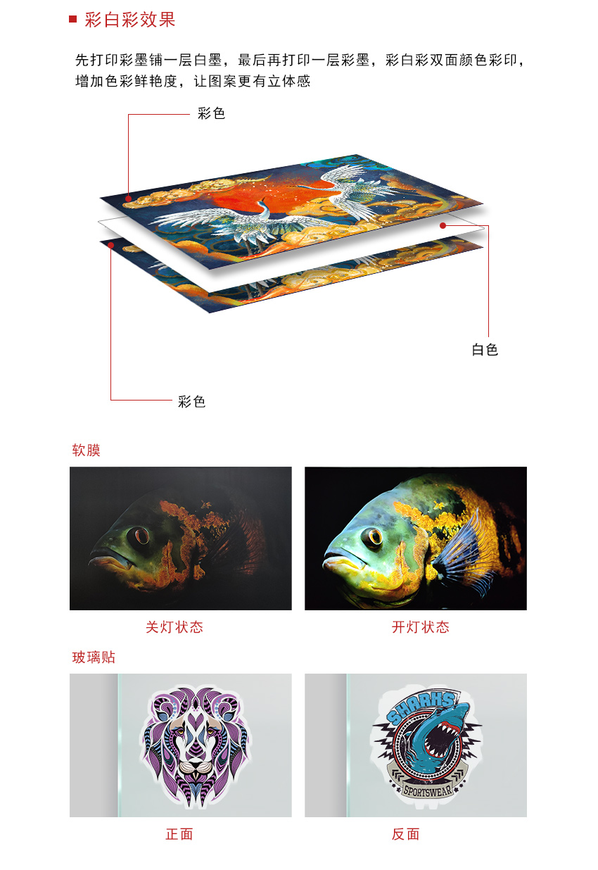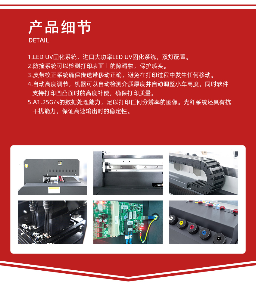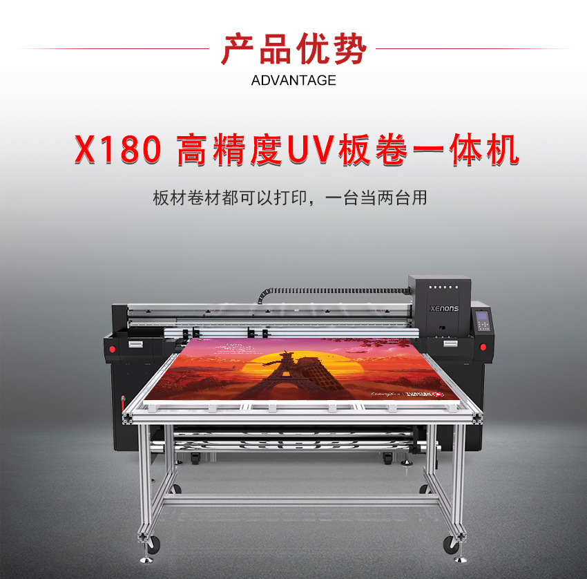 高品质和高性能UV板卷一体机 喷头:理光GEN5/GEN6 打印速度:35平方米/小时 颜色配置:CMYK+LcLm+白色 墨滴大小:7-21pl 打印尺寸:1800mm 分辨率:360*2400dpi 墨水:UV墨水 可打印各种卷材和板材,比如灯片、皮革、墙纸、瓷砖、金属标牌、木板、等,一台机器可以当两台使用,适合工业级个性化定制生产需求