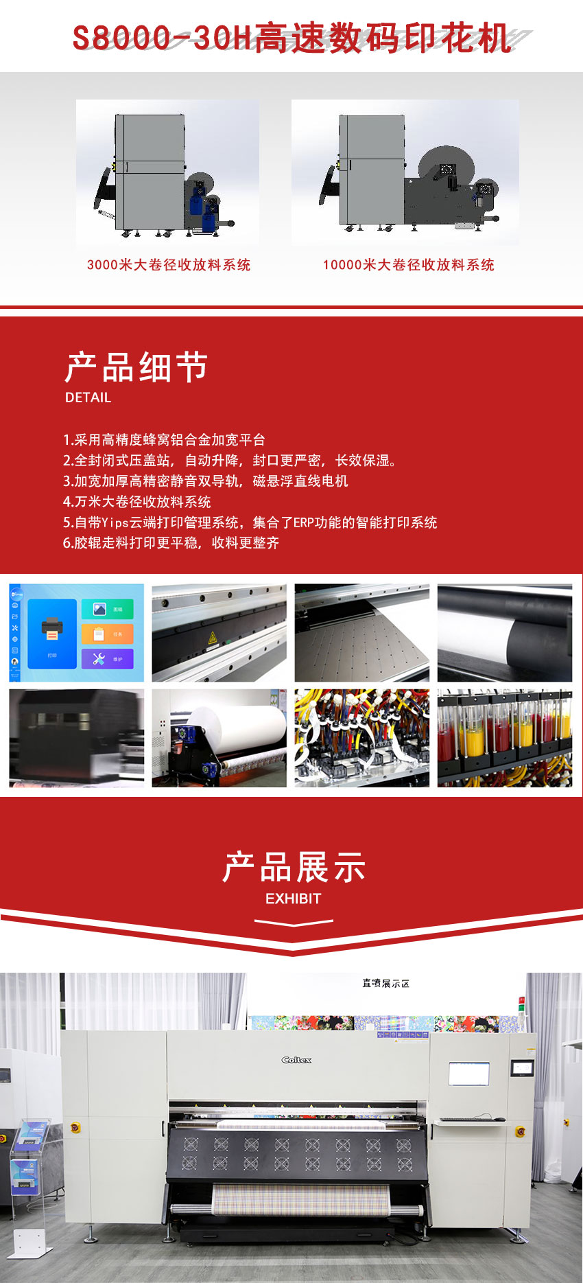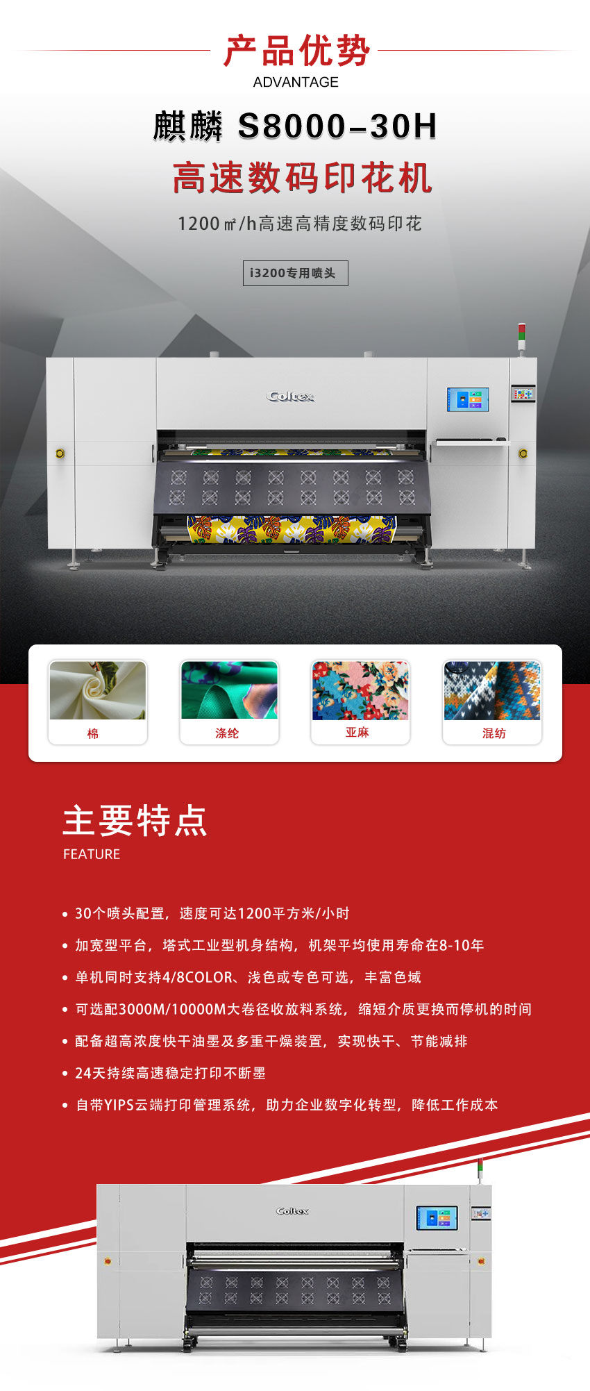 翔彩Coltex 麒麟S8000-30H高速数码印花机 工厂型数码纺织打印机,无压轮胶辊送料系统 打印更稳定,可24天连续高速打印不断墨 打印头:30 Epson i3200-A1 打印速度:1000㎡/h 打印宽度:2m
