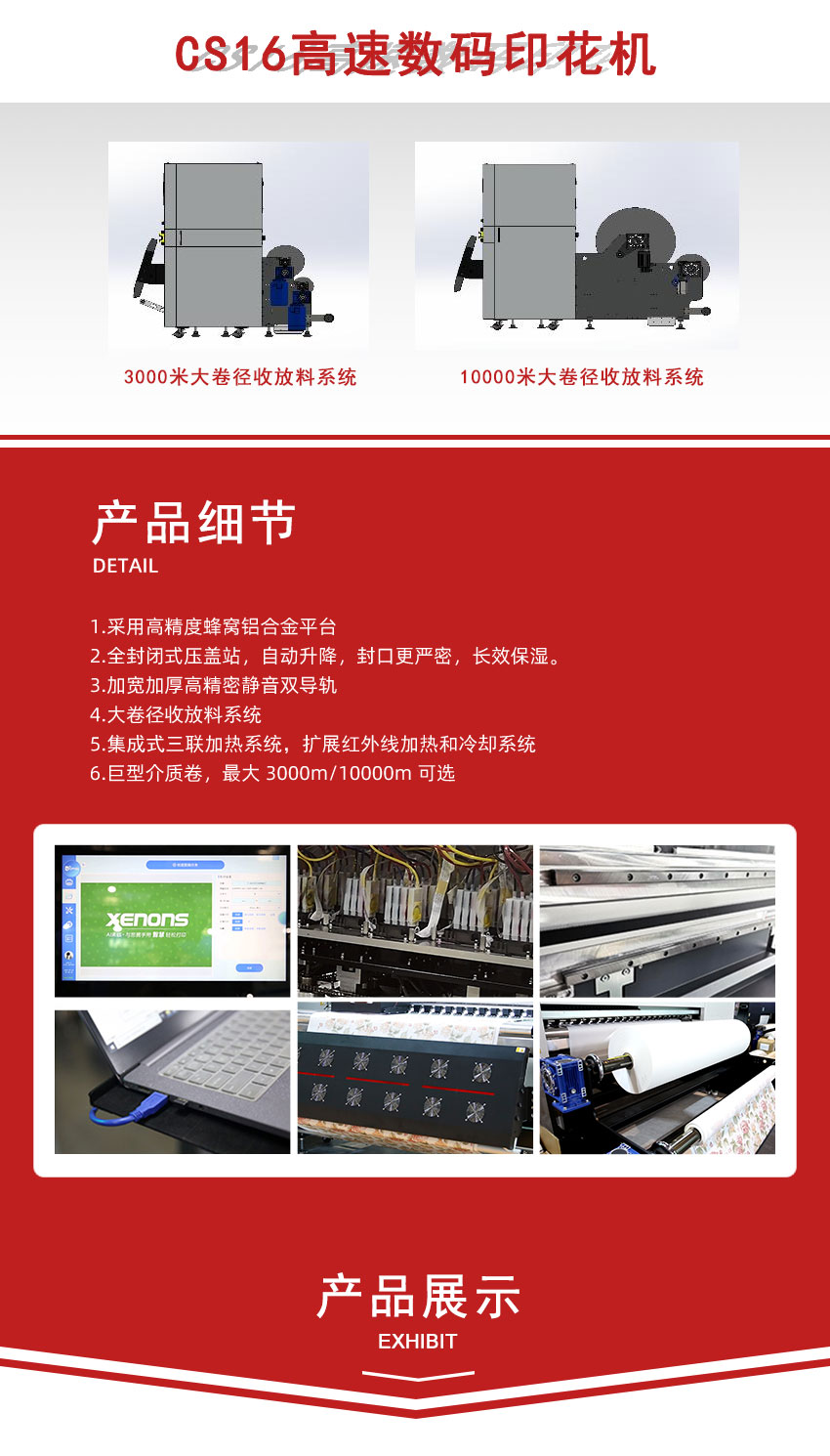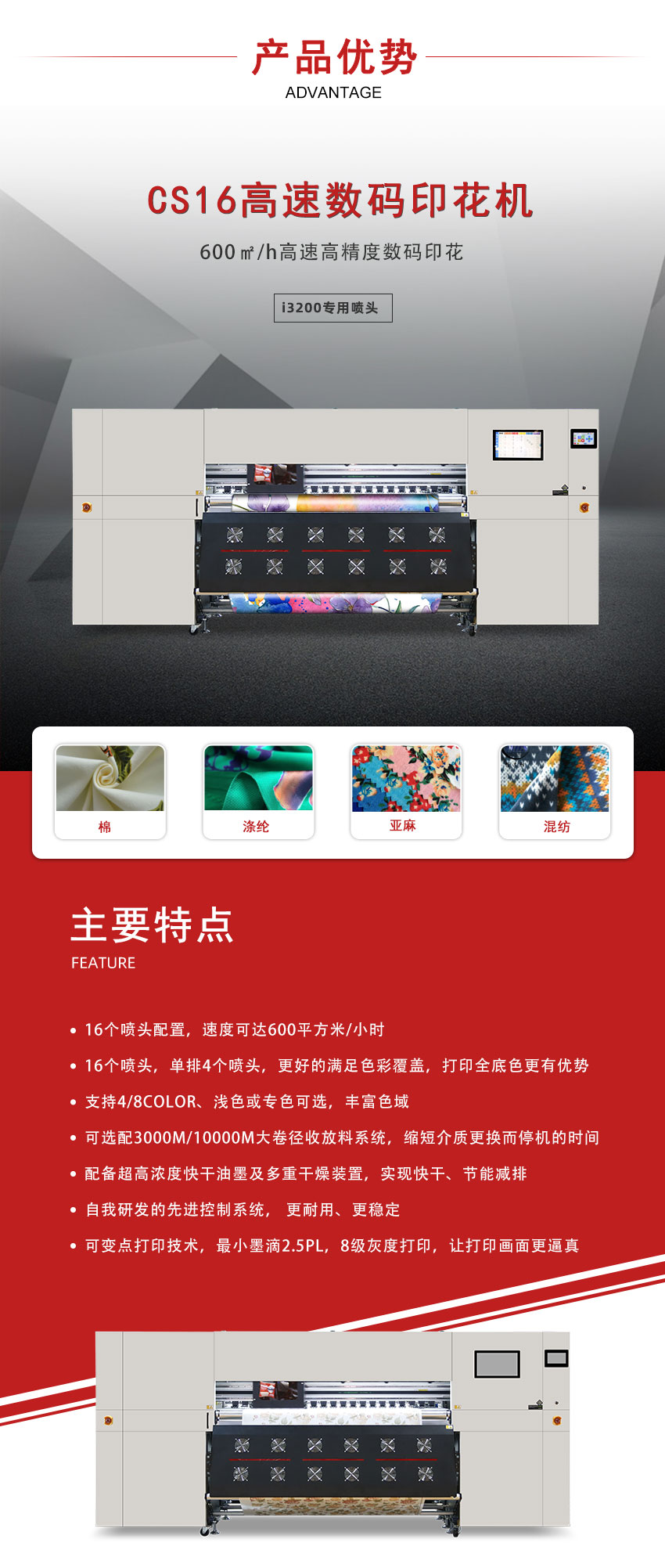 CS16工业级高速数码印花机,装配16个爱普生i3200喷头 万米收放料专业打纸机 打印速度可达640㎡/h,有效打印宽度 2米 2.5pl最小墨滴高质量高精度数码印花