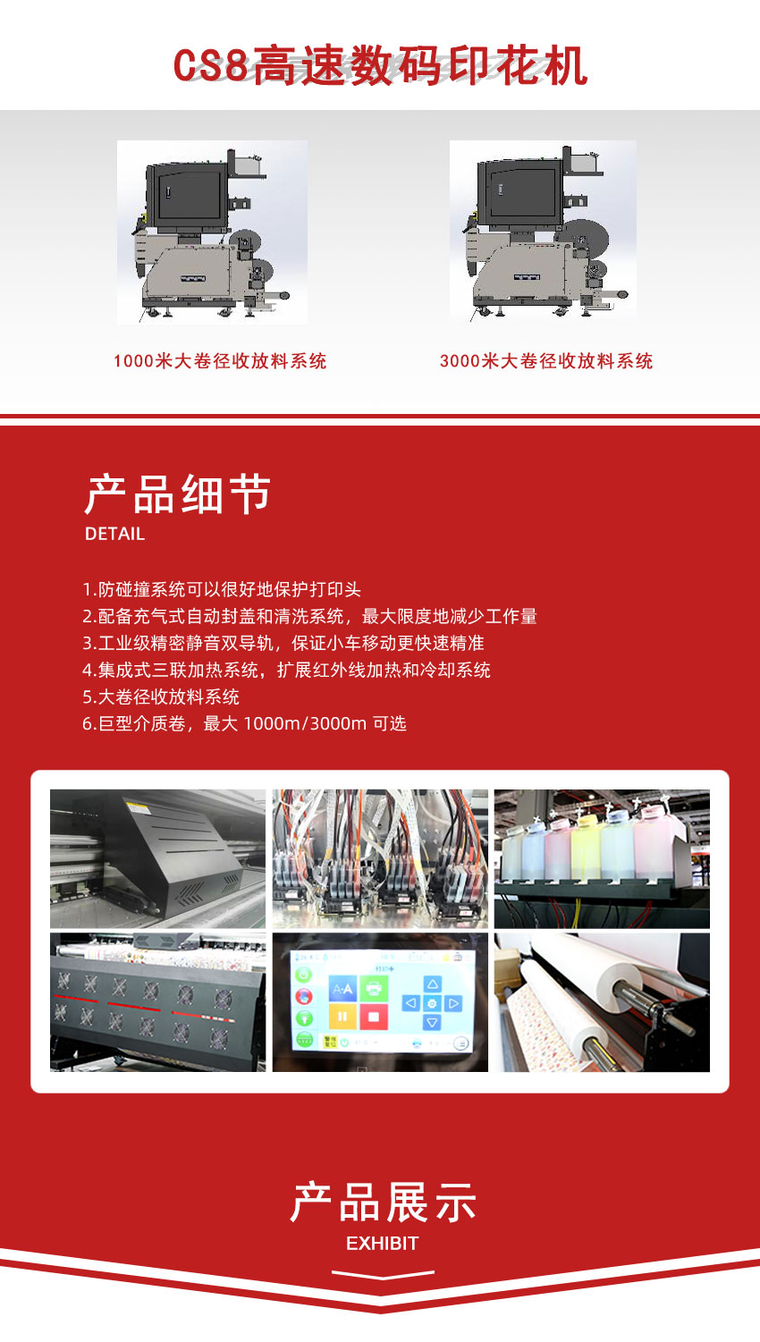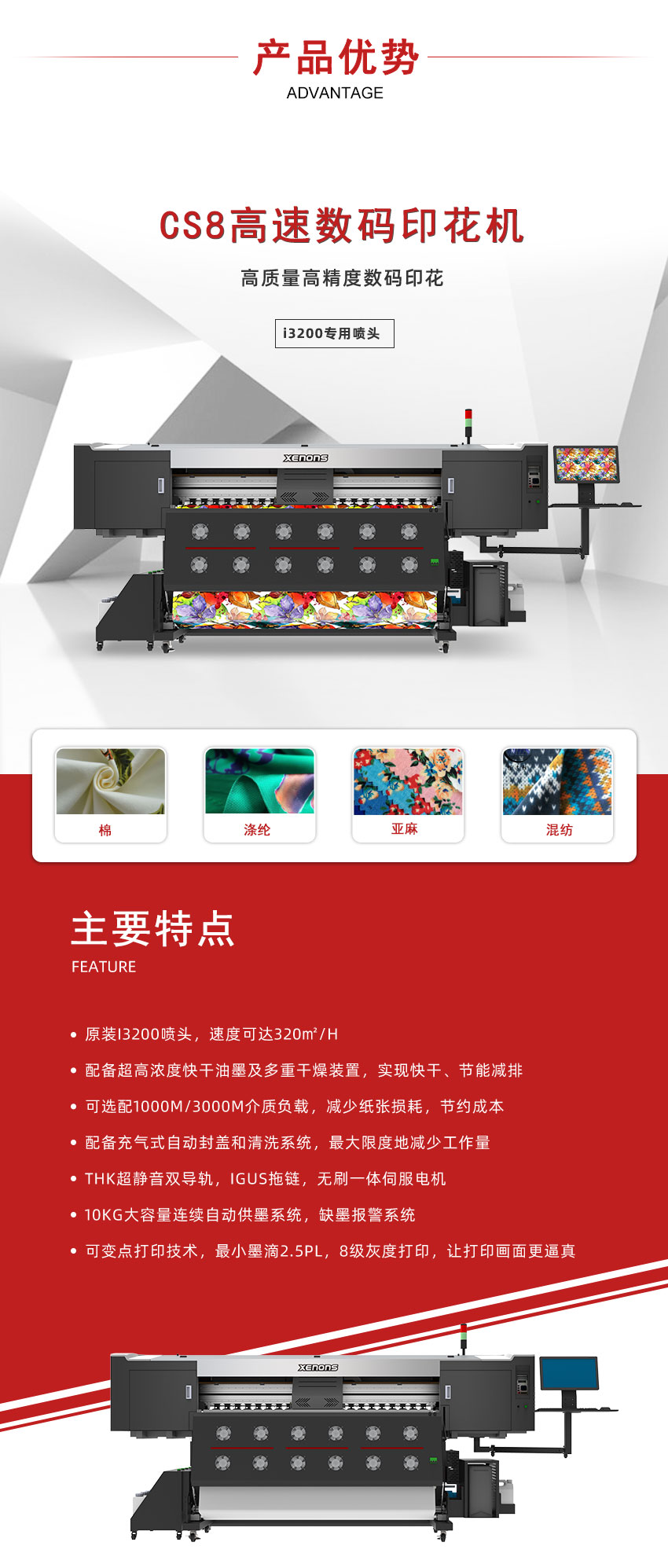 CS8 高速数码纺织印花机 喷头:i3200*8 打印宽幅:1.8米 打印速度:300㎡/h 打印精度:3600dpi 颜色配置:4色(KCMY) 墨水:水性、热升华墨水