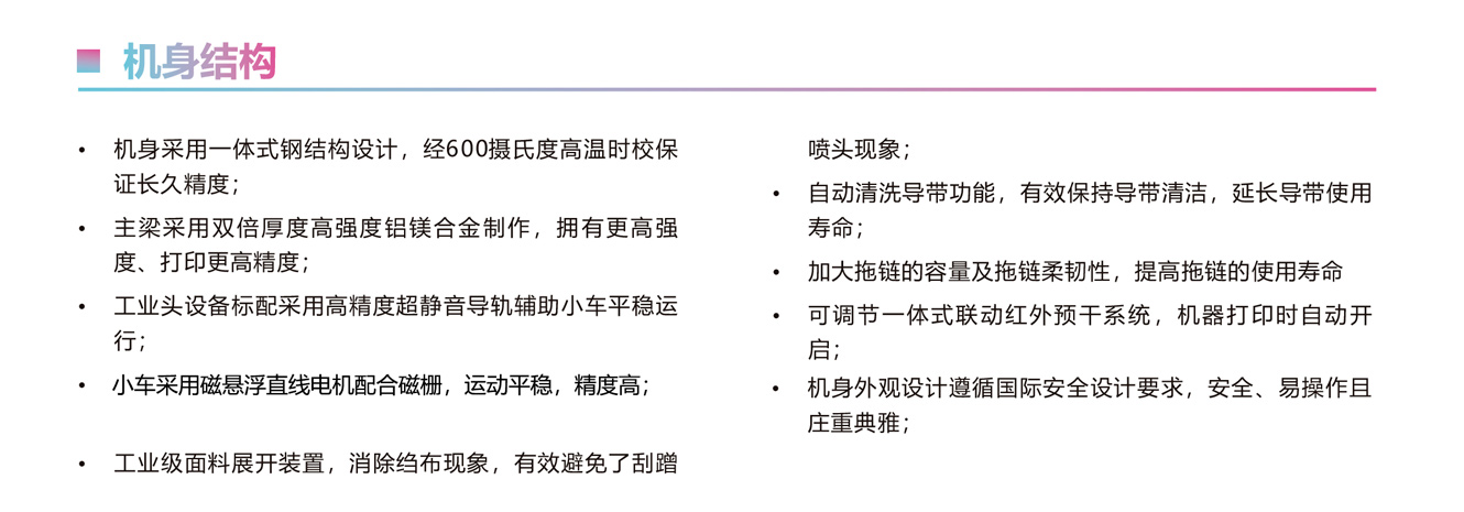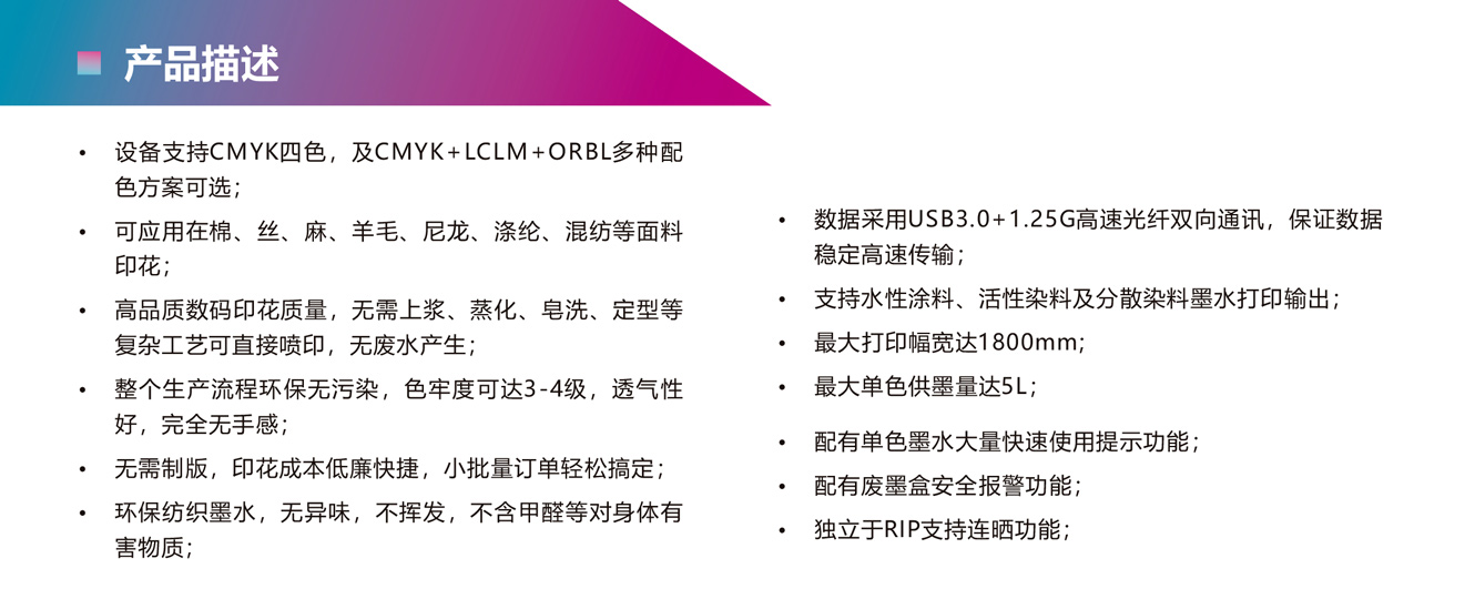 高质量印花,1.8米布料直喷印花机 无需上浆、蒸化、皂洗、定型等其他工艺直接喷印,无废水! 喷头:爱普生i3200 打印速度:150㎡/h 墨水类型:活性、酸性、涂料、分散(特制墨水) 打印宽幅:1800mm