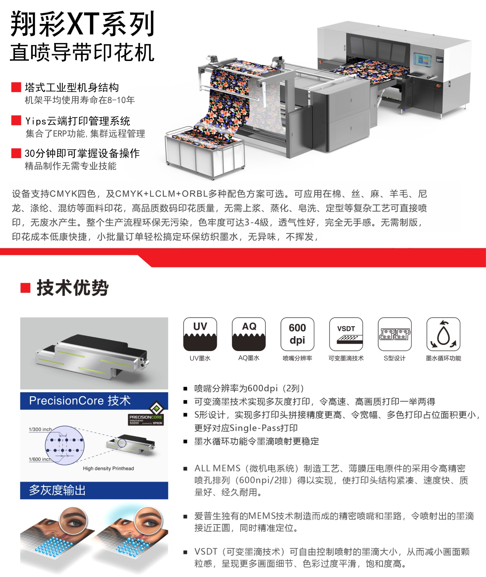 XT20 高速直喷数码印花机 无需上浆、汽蒸、皂洗、造型等工序直接打印,无废水! 打印头:爱普生 S3200 打印速度:360㎡/h 油墨类型:活性、酸性、分散、涂料