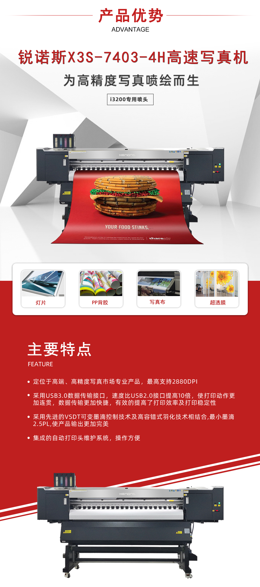 锐诺斯X3S系列高速写真机 装配爱普生i3200/F1440(DX5)专用压电喷头 打印时速80㎡/h,KCMY4色配置 有效打印宽幅1.88米,为高精度写真喷绘而生 可高速打印pp背胶、灯片、相纸、写真布、车贴、热转印纸等多种材料